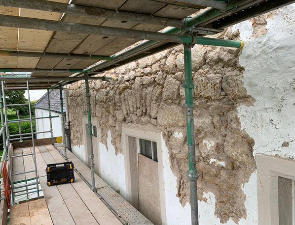 Stone & Lime Co carried out works to this A-listed private house in Midlothian. The old coatings were largely inappropriate modern materials and were failing or casing traditional finishes underneath to fail. We stripped off all coatings and applied a traditional Hotlime fully flush pointing and limewash coating to protect the building.